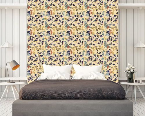 טפט קיר איור ציפורים ועלים בגוון כחול, תכלת על רקע בהיר